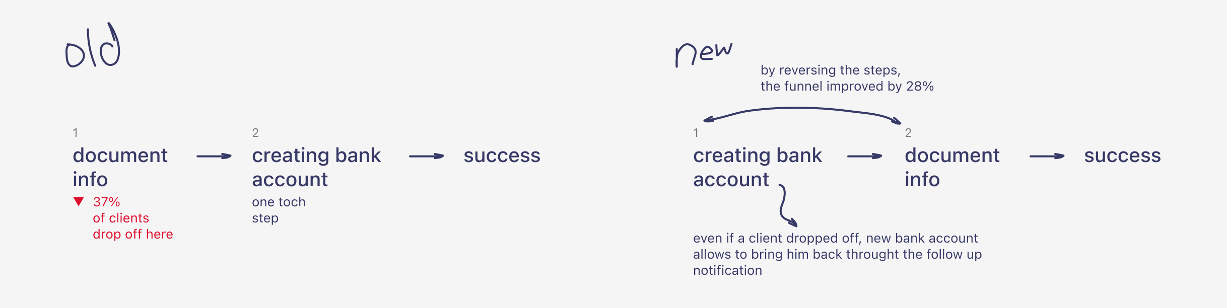 After noticing the old form with document input on the first step, I decided that the funnel could be improved by putting simpler steps first, which don't require searching for documents. New flow allowed for follow-ups with those who at least started the form. A/B testing showed a 28% improvement in the funnel.